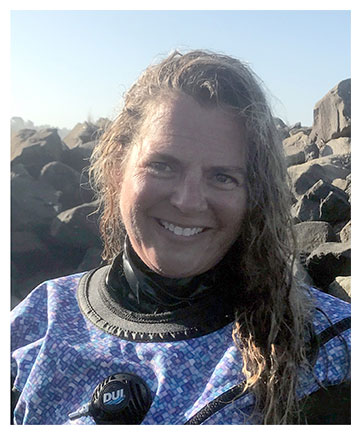 Diana Hollingshead graduated from the University of Oregon with a degree in Biology with heavy emphasis on Marine Biology. She became a PADI IDC Staff Instructor in 1997 and a DAN Instructor in 2010. When she became an AAUS Scientific Diver in 2013, she started as a volunteer diver for the Oregon Department of Fish and Wildlife, completing underwater Marine Protection Area surveys. In 2015, she became a volunteer Scientific Diver on the United States Forest Service dive team. She helped develop the volunteer diver training program and educates volunteer divers at the Oregon Coast Aquarium, where she has over 6000 volunteer hours. In 2018, she was inducted into the Women Divers Hall of Fame and currently serves as a board member.